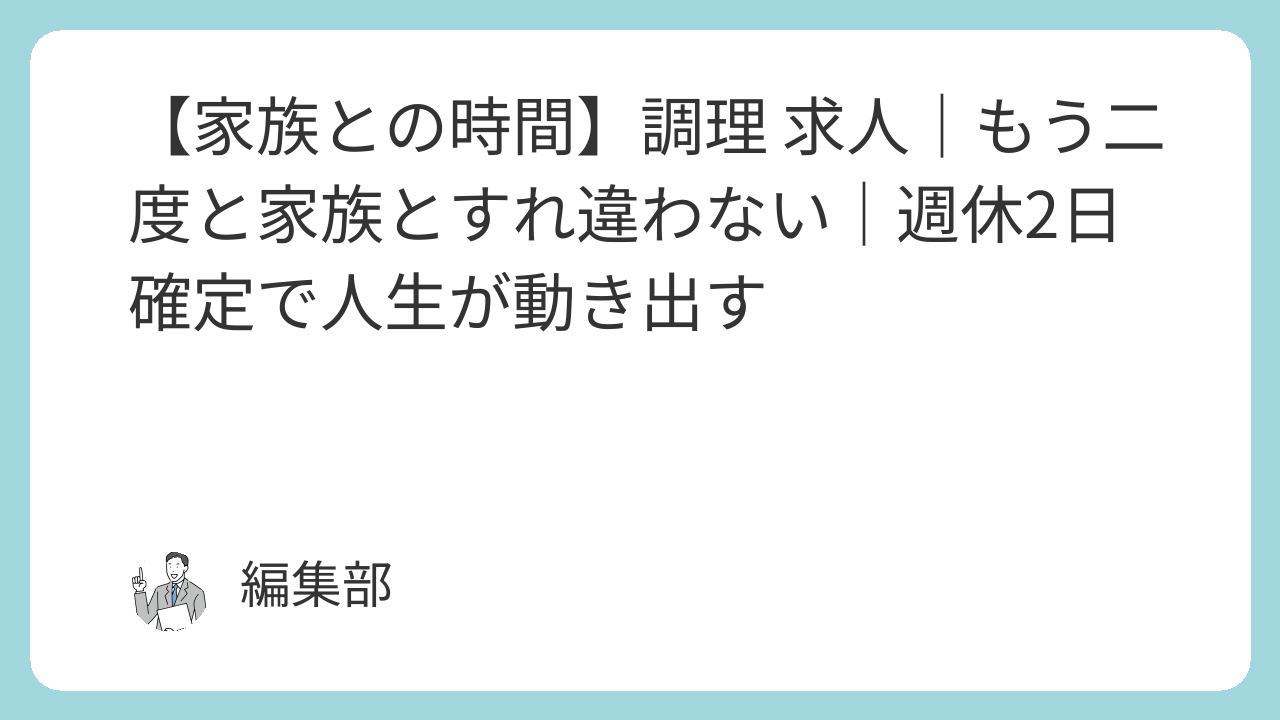 「調理 求人」探しの常識を覆すことで、週休2日が確実なだけでなく、年間休日が充実した職場を手に入れ、家族との輝かしい時間をもう一度取り戻せるでしょう。