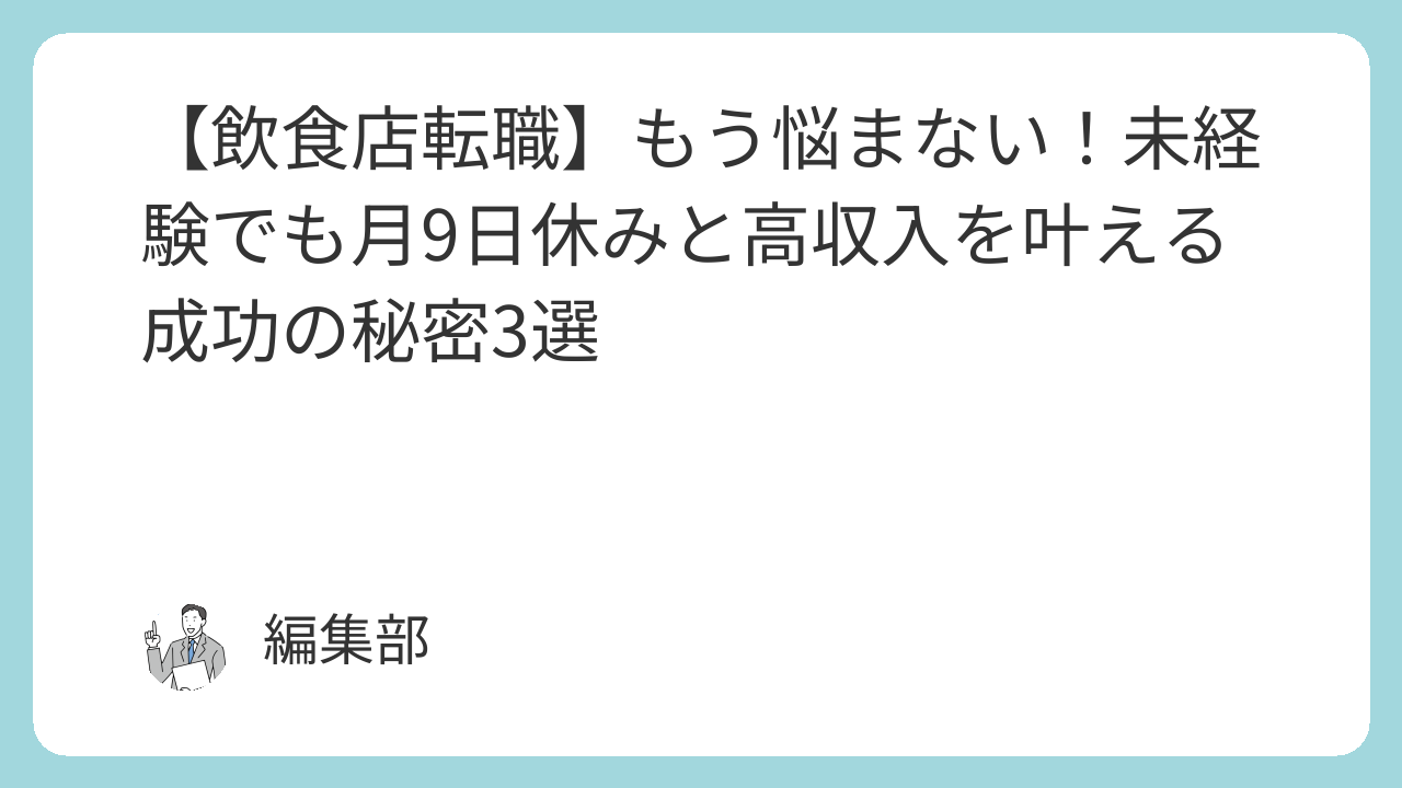 - Q未経験で飲食業界に転職しても、本当に月9日休みや高収入を叶えられますか?